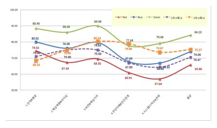 <그림 5-6> “ K목사의 제1차와 제2차 건강진단 비교” 그래프를 보면 K목사가 코칭 받기 전에 제1차 진단 때에 10가지 주제들의 평균치가 70.47이었다. 그러나 코칭을 받은 후 제2차 건강 진단을 했을 때는 75.27(+4.80)이었다. 4.80 포인트의 상승이다. 제1차 진단 때보다 제2차 때에는 더 건강해 졌다. 10가지 주제로 나누어 살펴보면 1-2)“인격과 영성”은 71에서 68.33(-2.67)로 하강, 3-4)“역량과 지도력”은 75에서 75(0)로 똑 같고, 5-6)“비전과 핵심가치”는 75.00에서 80.33(+5.33) 상승, 7-8)“주민이해와 인간관계”는 67.00에서 79.00(+12)로 상승, 그리고 9-10)“시스템 디자인과 전략”은 64.33에서 73.67(+9.34)로 상승했다. 코칭을 받은 후 제2차 진단에서 K목사가 가장 많이 상승한 부분이 주민이해와 인간관계(+12.00), 그리고 시스템 디자인과 전략(+9.34)이다. 그리고 “비전과 핵심가치(+5.33)”이다. 이는 그가 “주민애해와 인간관계”를 맺기 위해 부단히 노력했다는 사실과 “교회 시스템을 새롭게 디자인하고 전략”에 초점을 두었다는 말이다. 이에 대해서는 다음에 나누게 될 것이다.